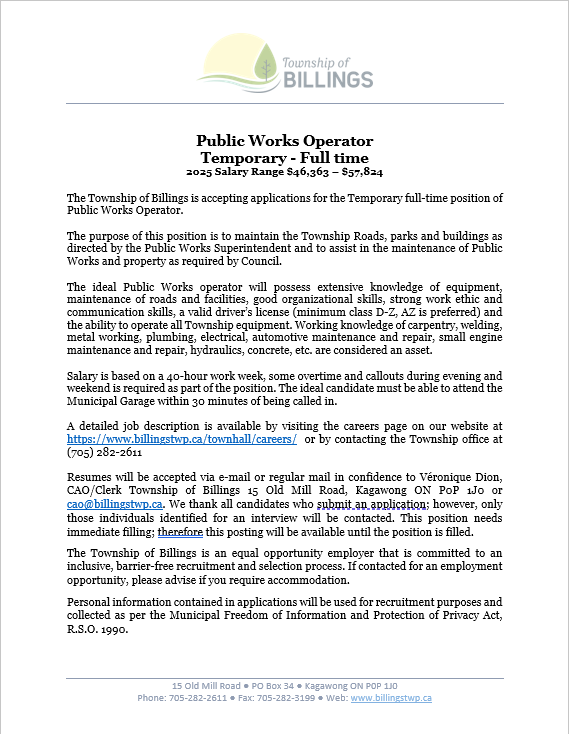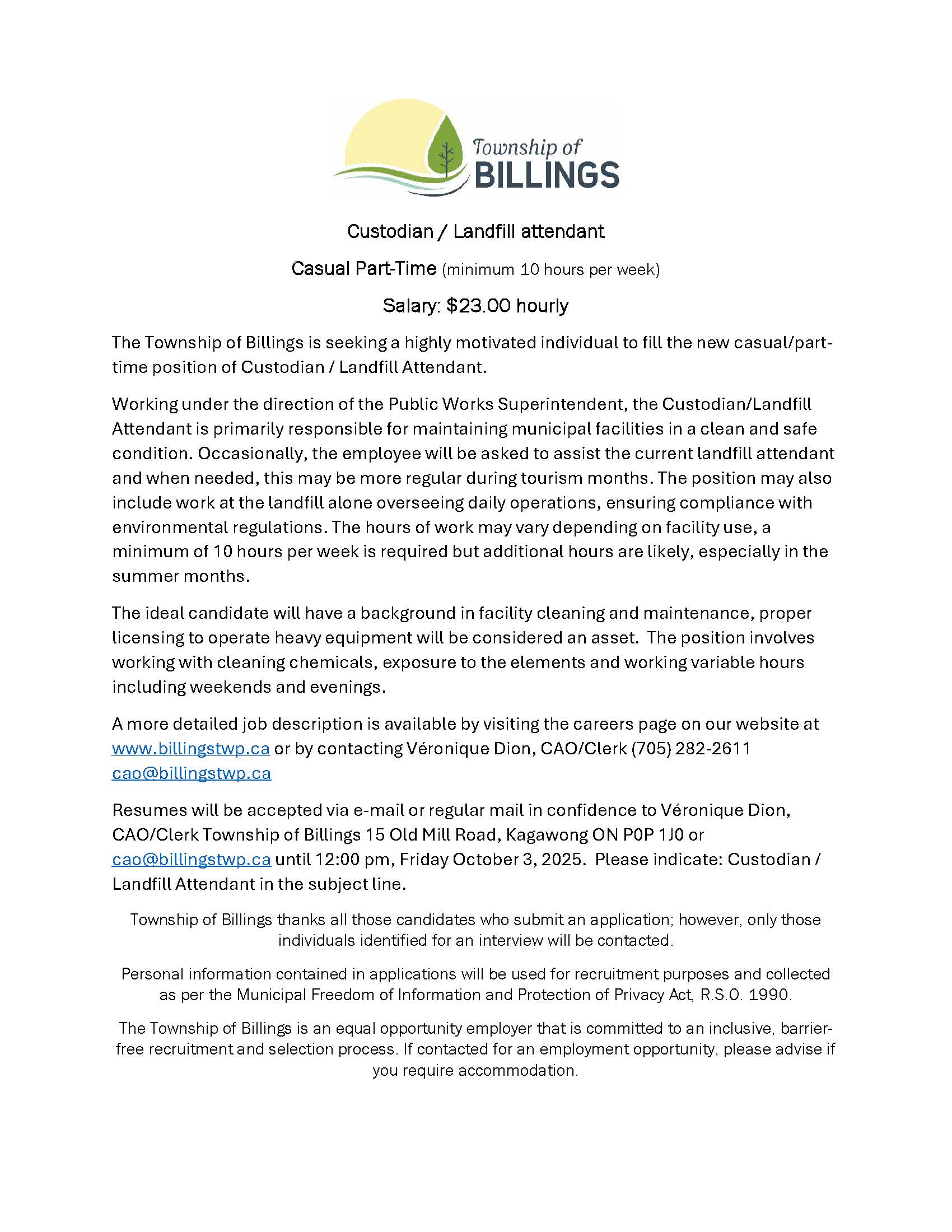 The Township of Billings is hiring for a Custodian/ Landfill Attendant (Casual Part-time).